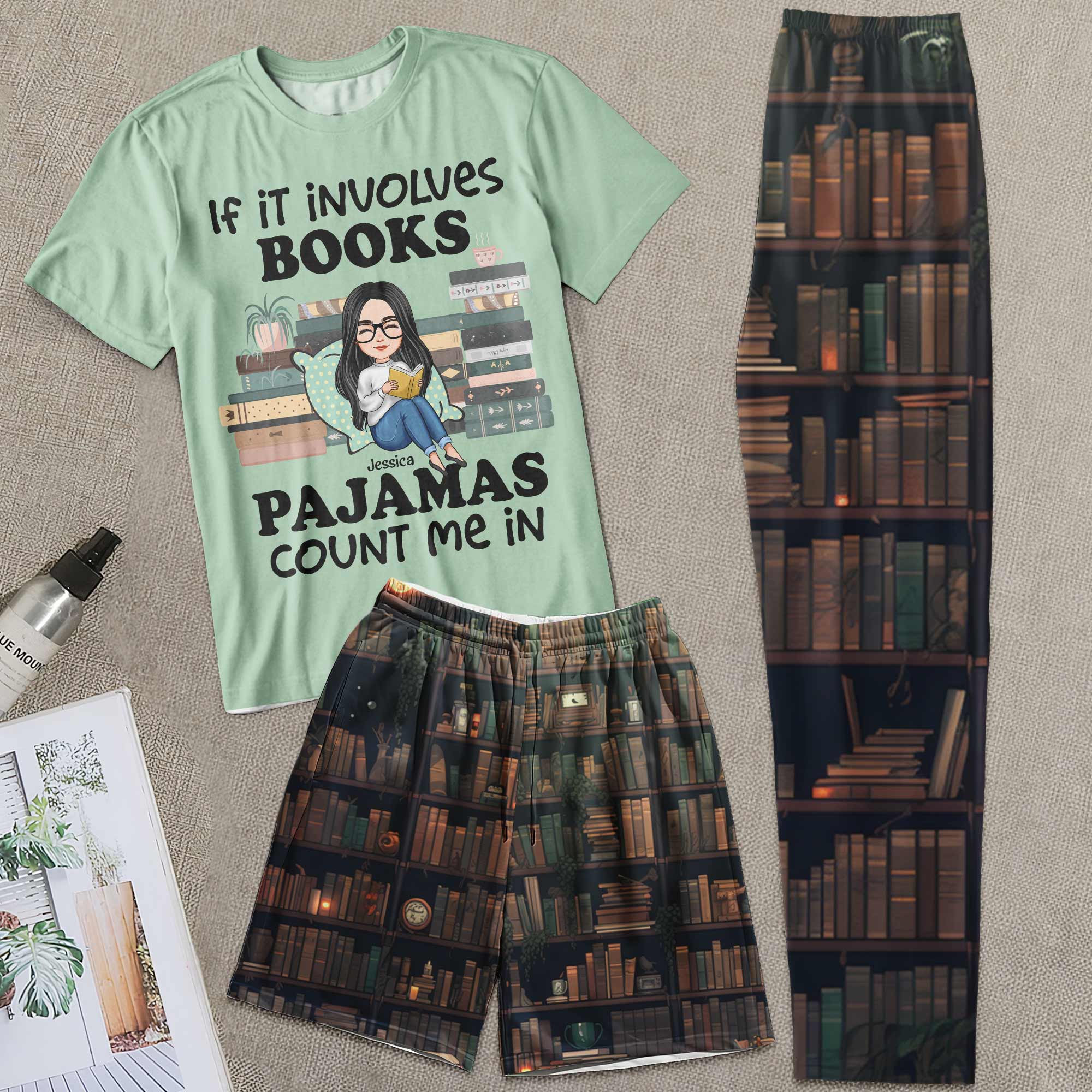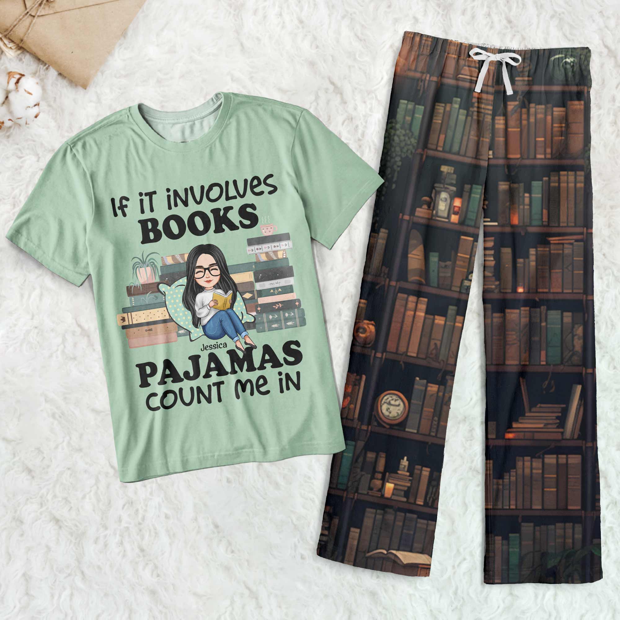 If you love reading and relaxing in your pajamas, this personalized pajamas set is for you. This pajamas set features a fun and catchy phrase “If it involves book and pajamas, count me in” on the pajama shirt, along with a character of yourself sitting around book piles. You can customize the character to match your appearance, making this a truly unique and personal gift.
