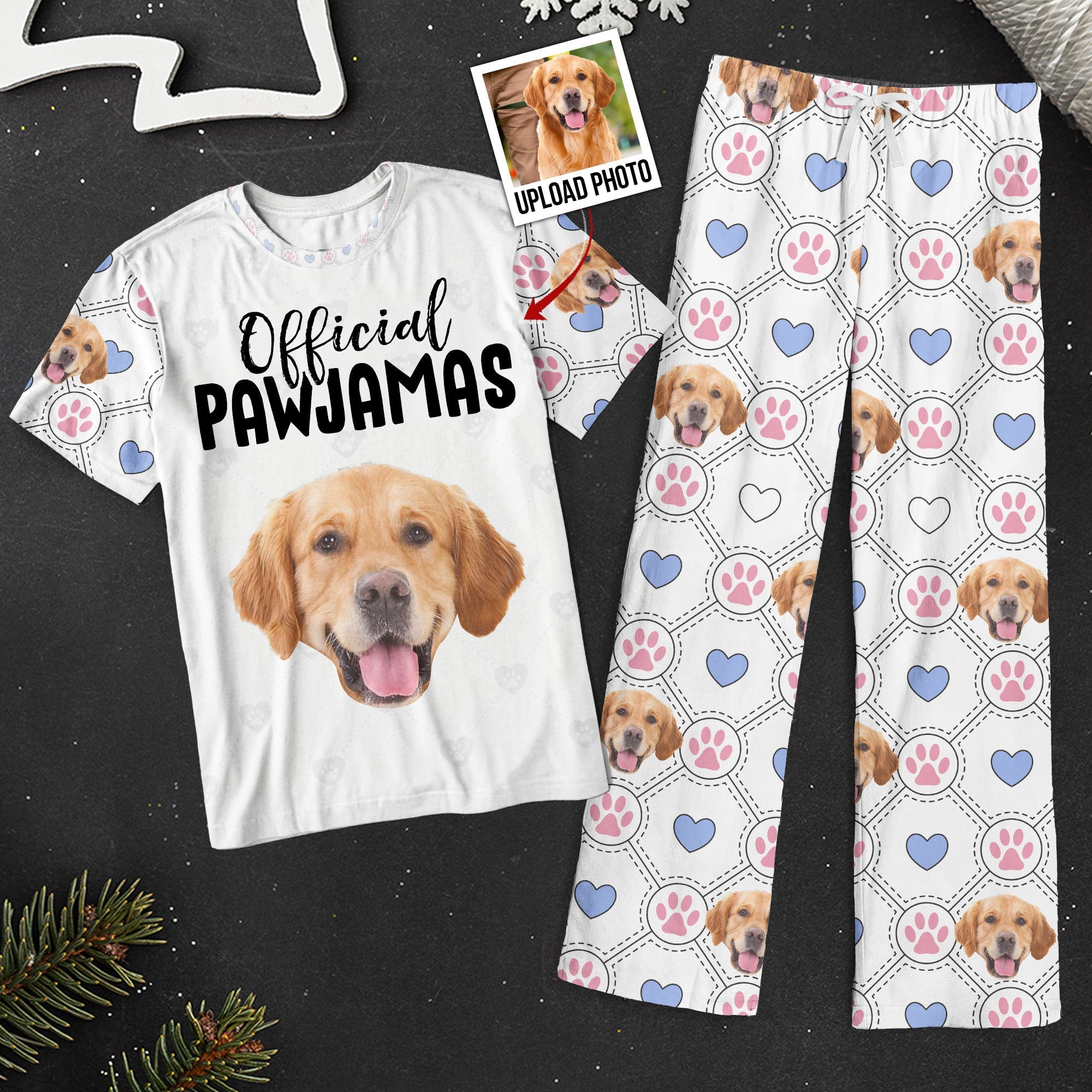 Show your love for your pet and your sense of humor with these funny and cute personalized photo pajamas. These pajamas feature a design of 'Official Pawjamas' on the pajama shirt, along with your name. You can also customize the pajama shorts with your pet's photo., making this a truly unique and personal gift.